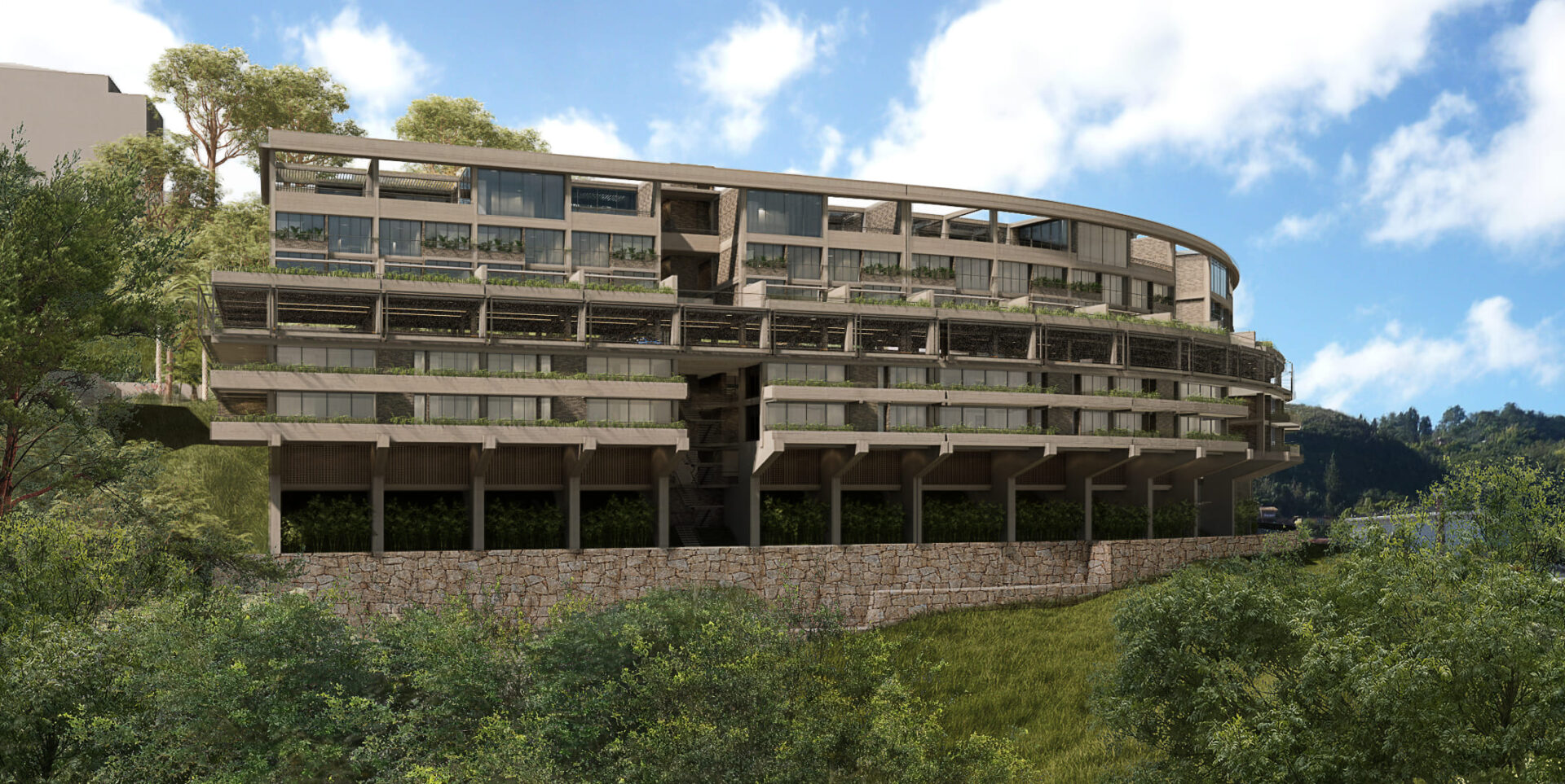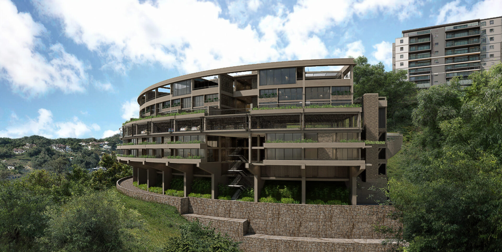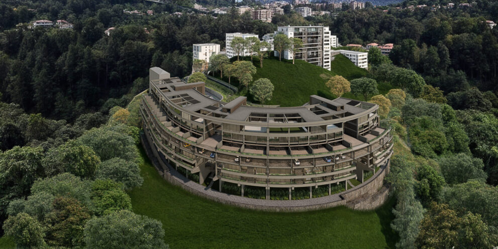 Se exploraron junto al cliente diferentes opciones, entre ellas la posibilidad de utilizar una edificación tipo, que pudiera repetirse hasta tener tres torres iguales. Esta estrategia, comúnmente utilizada, producía por la repetición de la pieza, una pérdida de valor, sin contar con los retos constructivos y financieros que suponía la construcción de un estacionamiento de planta reducida que obligaría a generar numerosas rampas que a su vez se repetirían en cada una de las torres. Otra opción, que resultó ser la seleccionada para el desarrollo del proyecto, consistía en la idea de una cinta que se extendiera a lo largo de la colina a la manera en que Affonso Eduardo Reidy lo hace en Pedregulho (Río de Janeiro, 1947. primera imagen) o J. Alcock en Altolar (Caracas, 1969. Segunda imagen). Esta alternativa generaría una imagen potente dentro del paisaje del sector, creando una pieza con singularidad arquitectónica en el lugar.