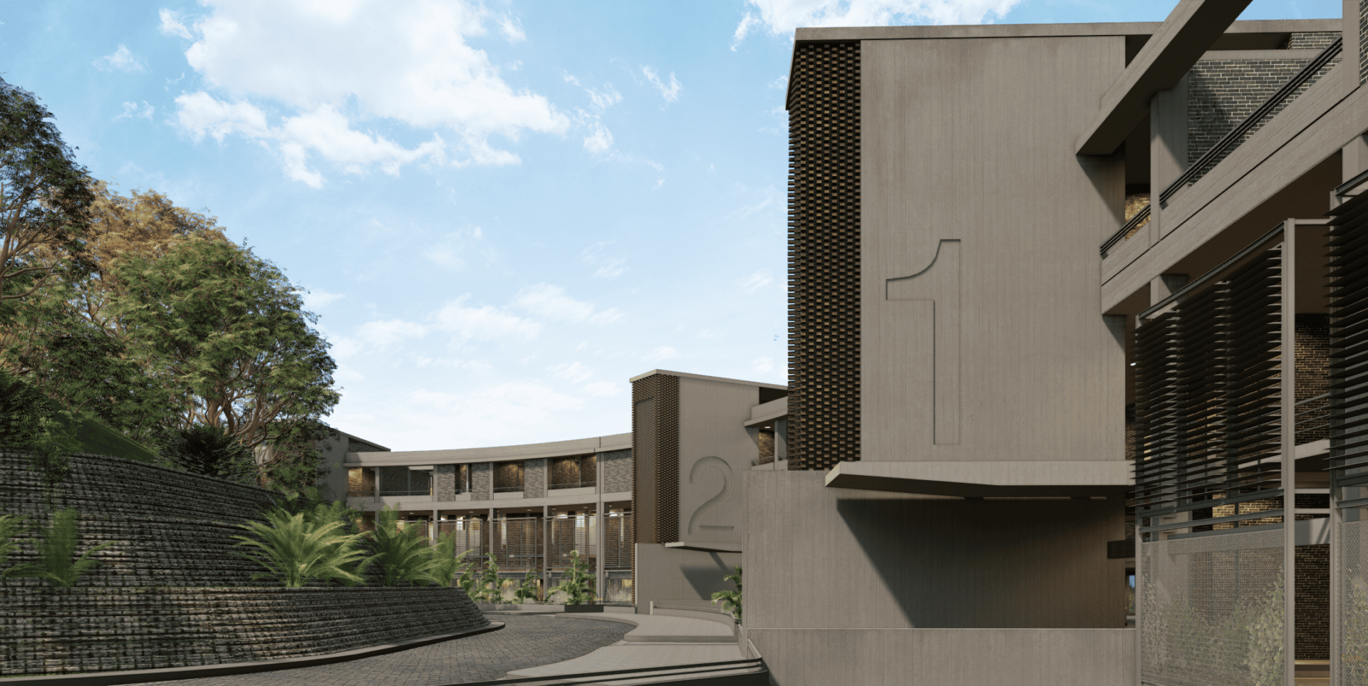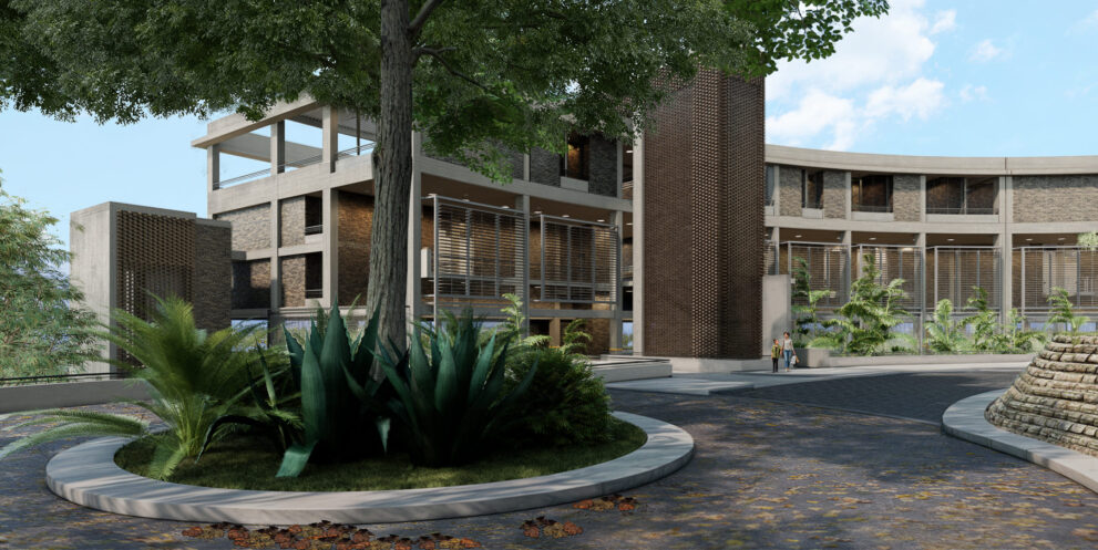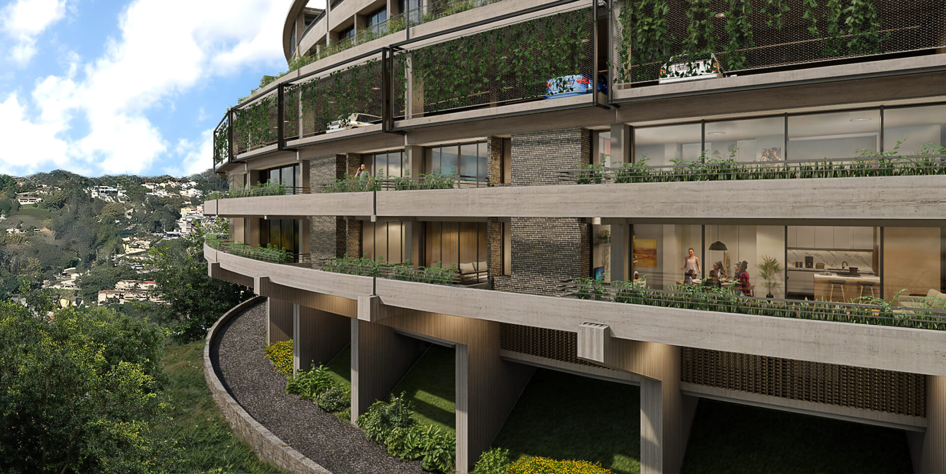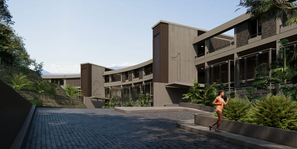 Se exploraron junto al cliente diferentes opciones, entre ellas la posibilidad de utilizar una edificación tipo, que pudiera repetirse hasta tener tres torres iguales. Esta estrategia, comúnmente utilizada, producía por la repetición de la pieza, una pérdida de valor, sin contar con los retos constructivos y financieros que suponía la construcción de un estacionamiento de planta reducida que obligaría a generar numerosas rampas que a su vez se repetirían en cada una de las torres. Otra opción, que resultó ser la seleccionada para el desarrollo del proyecto, consistía en la idea de una cinta que se extendiera a lo largo de la colina a la manera en que Affonso Eduardo Reidy lo hace en Pedregulho (Río de Janeiro, 1947. primera imagen) o J. Alcock en Altolar (Caracas, 1969. Segunda imagen). Esta alternativa generaría una imagen potente dentro del paisaje del sector, creando una pieza con singularidad arquitectónica en el lugar.