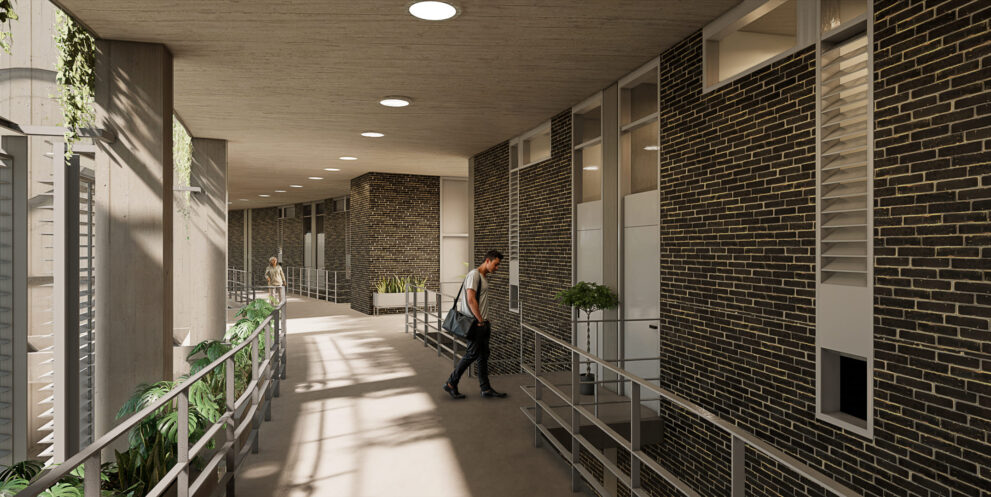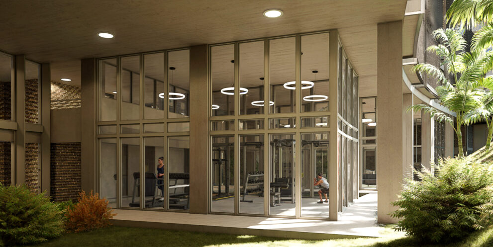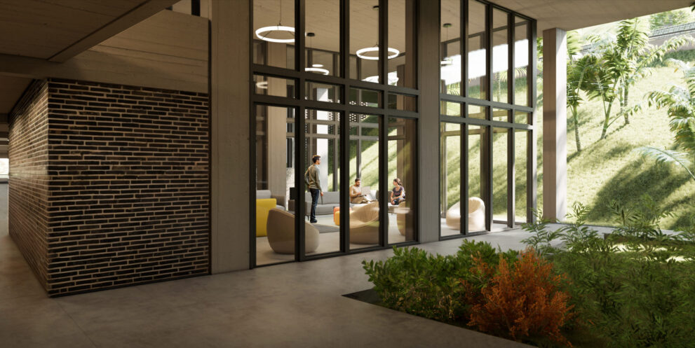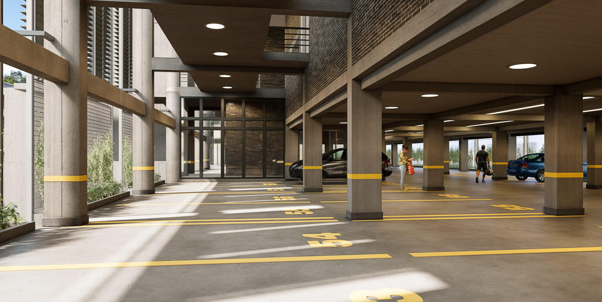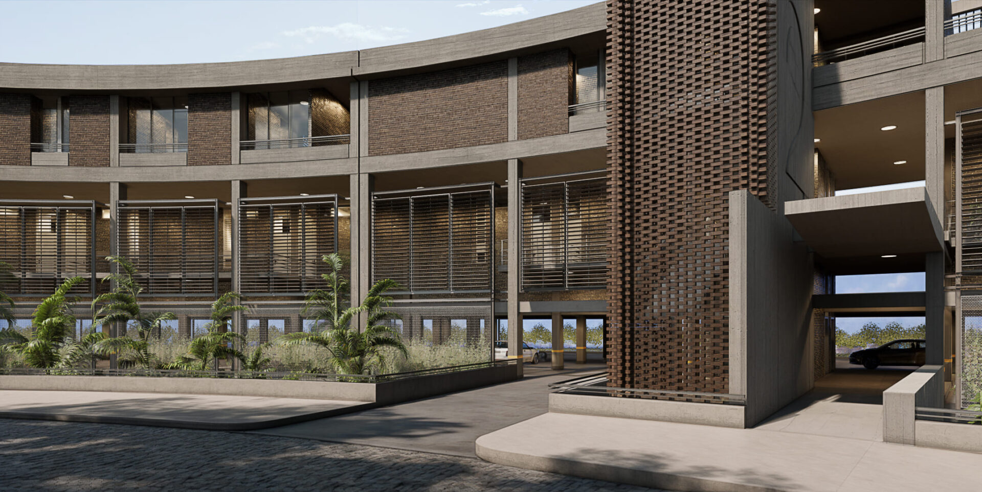Esa estrategia de implantación, debía contemplar en su desarrollo la necesidad de alcanzar los puestos de estacionamiento necesarios para el conjunto con la inversión financiera y arquitectónica más eficiente.  Acá se optó por una aproximación no convencional, ubicar el estacionamiento en un nivel intermedio de la edificación, eliminando así por completo las rampas y aprovechar su situación para vincularlo con las áreas comunes (gimnasio, salón de fiestas, área de co-working, etc.)