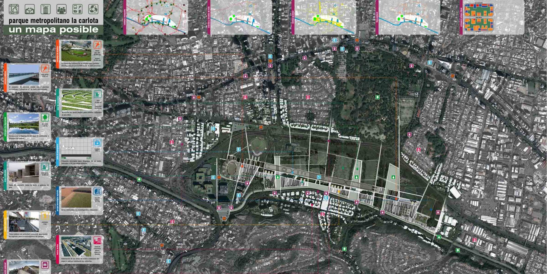 Un Mapa Posible y Paisaje Topográfico son dos propuestas para el Parque La Carlota elaboradas por el mismo equipo. La decisión de realizar dos propuestas nace de la profundidad y complejidad del temario de la ciudad y de los escenarios posibles de implementación del parque Metropolitano.